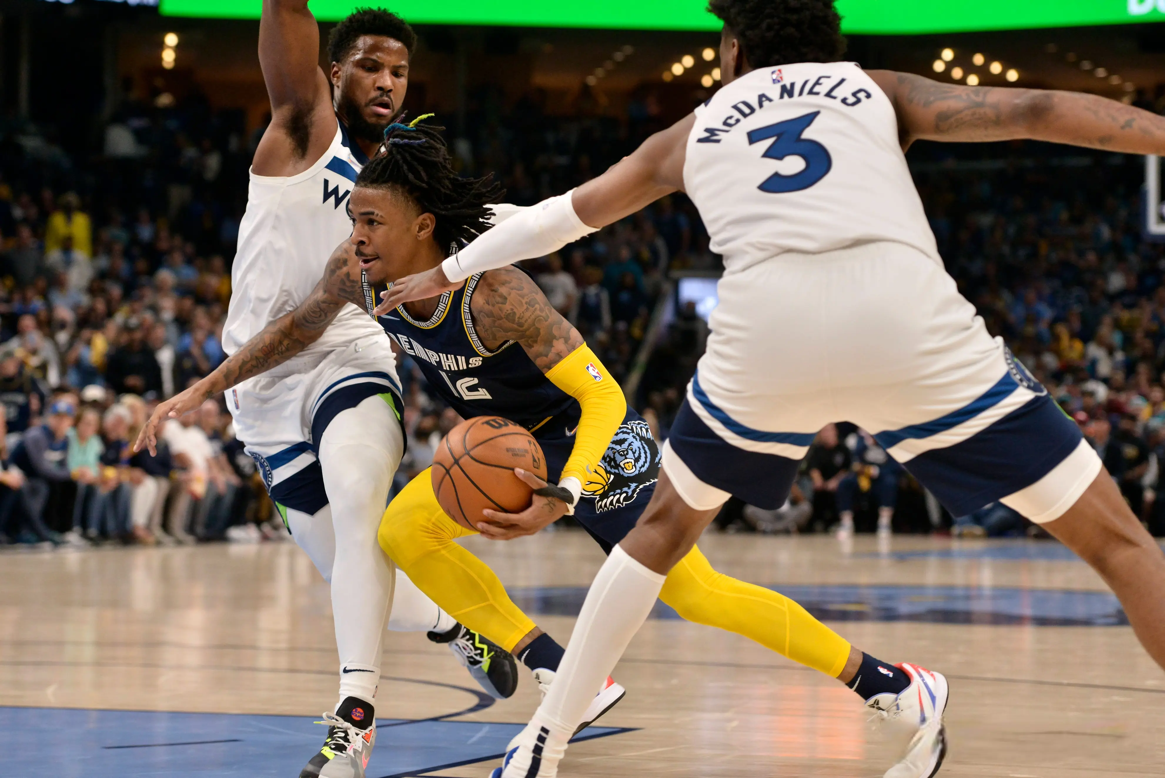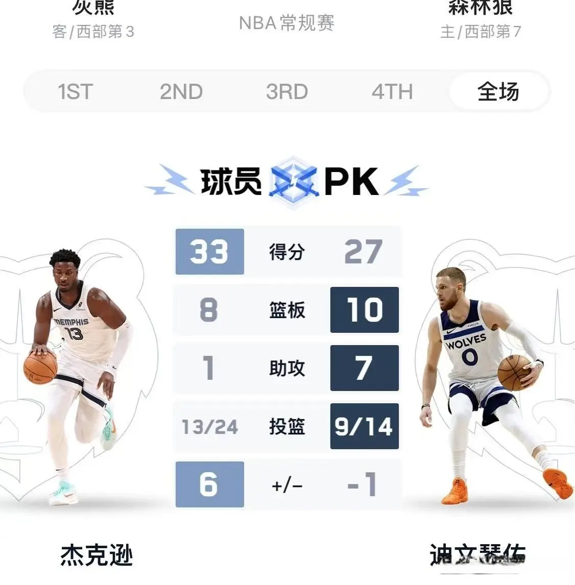 首节比赛双方上来火力全开,除了爱德华兹和莫兰特的表现不佳外,其他人都是手感火热,首节结束灰熊35-33领先2分。次节比赛双方双方依旧是打的难解难分,森林狼这边有迪文琴佐和里德,灰熊则有杰克逊,半场结束森林狼65-64反超1分。莫兰特半场7中1。