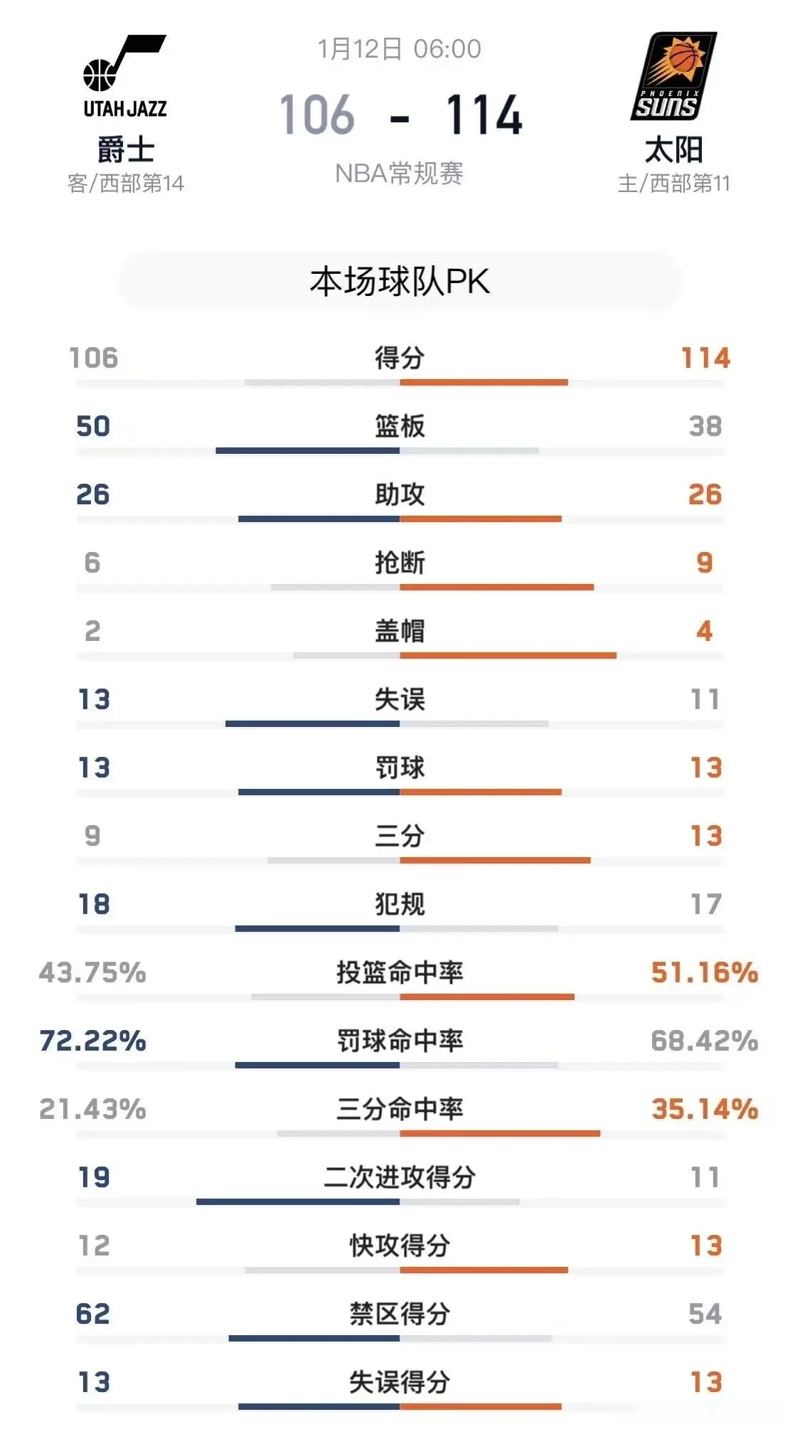 太阳:布克34分5篮板4助攻、杜兰特25分5篮板7助攻、邓恩10分、普拉姆利6分10篮板、比尔12分、阿伦14分4篮板4助攻。