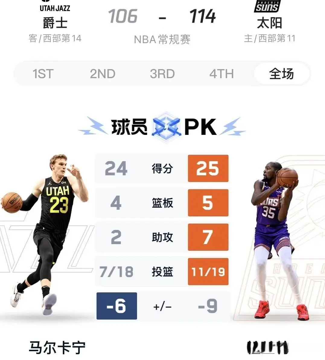 下半场开始后太阳习惯性断电的毛病又犯了。爵士上来立马回敬了太阳一波12-2的攻击波将分差追到1分。关键时刻还得是杜兰特,在他的镰刀挥起来后太阳10-2的攻击波回敬对手。三节打完太阳依旧领先8分。末节爵士虽然努力追分,但是太阳这边总能做出回应,最终太阳114-106拿下爵士。